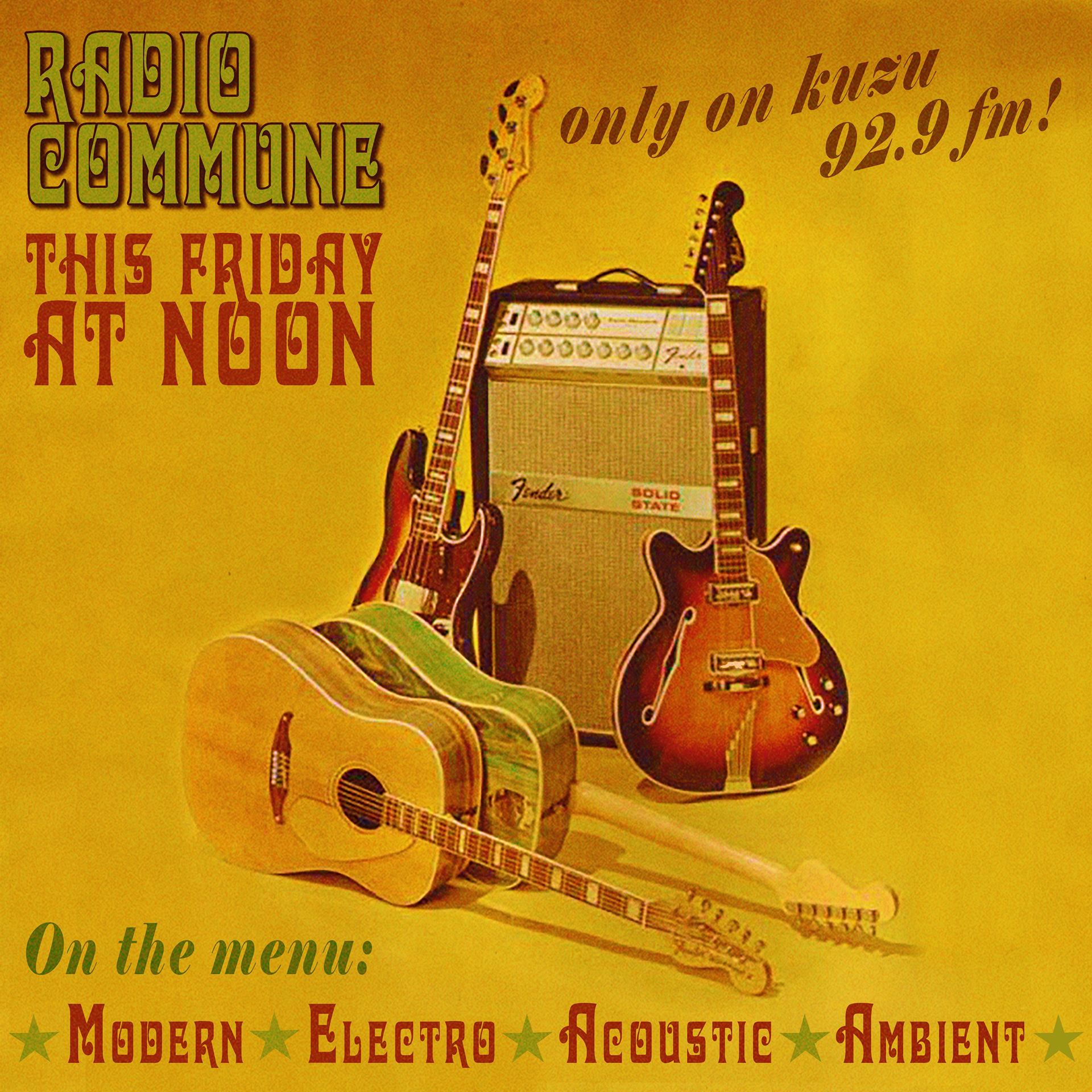 Radio Commune is a bi-monthly radio show on Denton's only non-profit station, KUZU 92.9 FM. Since October 2020, I have collaborated with host Jack Lundsgaarde to create the brand identity and art direction of the show. With every show, I design both an announcement, show cover, and set list which is posted to the Radio Commune Instagram & Facebook.